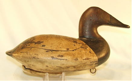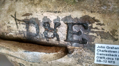 This brand is on a canvasback drake made by John B. Graham, Charlestown MD, circa 1887. At one point it was part of a rig used by market hunter Richard K Barnes of Carpenters Point, Cecil County MD and bears his mark as well. The identical brand, complete with superimposed “h,” was used on at least two other known decoys of similar vintage, and others may exist. Given that few collectors have seen the brand, one assumes it was never used by the Dye family on any of their rigs, but little is known for certain.